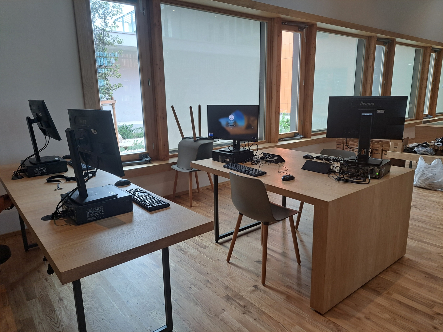 La salle de lecture, au cœur du métier des archivistes, se pare des équipements nécessaires à son fonctionnement. Les ordinateurs ont été installés, les numériseurs en libre-service mis en place et les instruments de recherche vont progressivement orner les étagères.