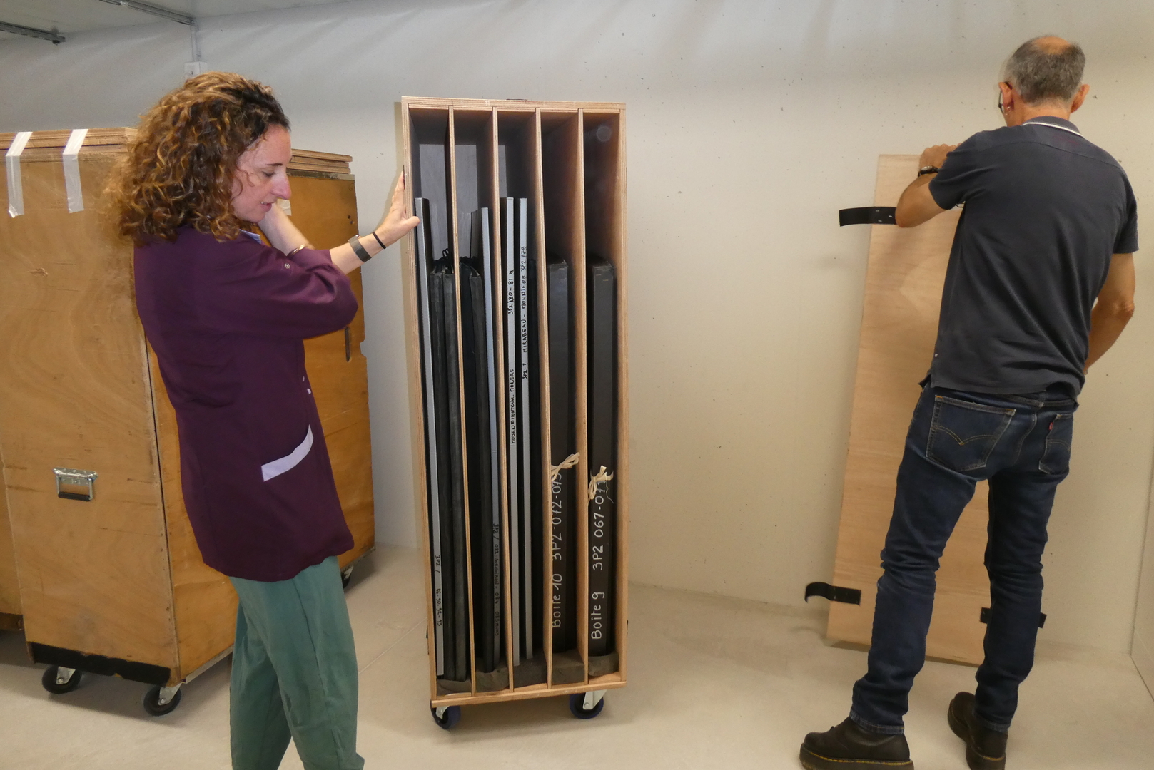 Ce modus operandi est bien rodé mais il existe une catégorie de documents pour laquelle les archivistes interviennent directement. Ils prennent en effet en charge le délicat placement des plans du cadastre. Après livraison des documents en magasin dans des armoires mobiles adaptées à leur typologie particulière, les plans sont ensuite extraits de leur boîte, dépoussiérés et placés à l’unité dans les tiroirs des meubles à plans.