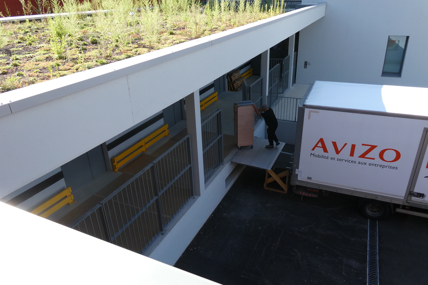 Dès lundi, les cartons contenants les dossiers de travail du personnel ont commencé à arriver dans les locaux, suivis de près par le matériel informatique et l’équipement de la salle de numérisation. Depuis le quai de déchargement de Memento, l’équipe des déménageurs assure un travail colossal pour acheminer les cartons à la bonne adresse dans un bâtiment de 11 600 m2 qui compte 4 niveaux.