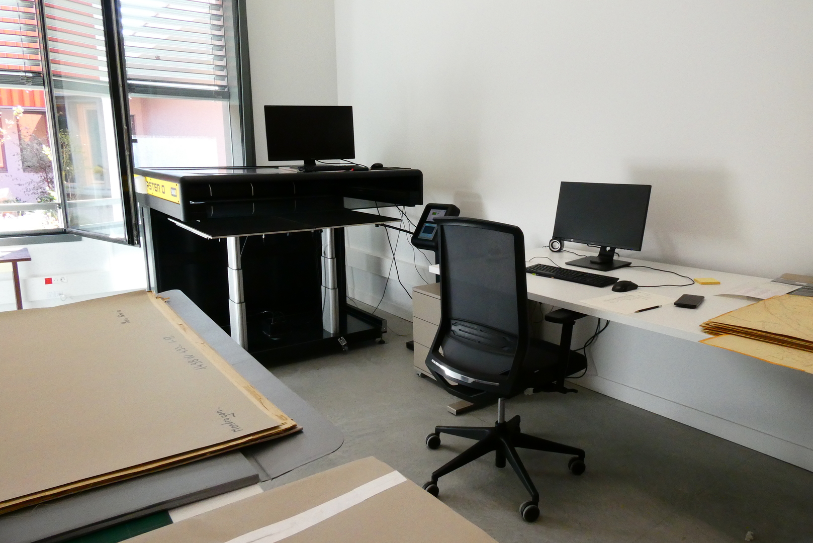 Si les documents arrivent très progressivement à Memento, certains à peine arrivés dans leur nouvel environnement, sont illico expédiés en salle de numérisation. L’agent, très à l’aise devant son scanner A0, est en train de traiter les plans du cadastre révisé (1931-1974) cotés 1498 W.